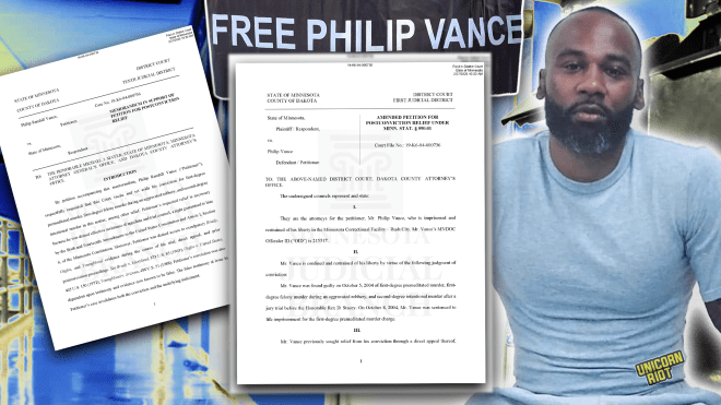 As Vance’s cycle of waiting gets reset, Unicorn Riot is publishing all of Vance’s recent court document filings, including the postconviction relief petition (pdf), which we briefly summarize below and that you can read along with Vance’s legal team’s memorandum to support the petition (pdf). Find all of the documents in our vault, including the affidavits of recanted testimony from statements that were used to support the original jury indictment and the later murder trial of Vance.
