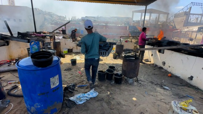 In the west side of war-torn Gaza City, Unicorn Riot was given a tour of the makeshift processing center where plastic waste is melted into diesel. “The country needs diesel—it needs to move,” said 22-year-old worker Saad Abu Ajwa, “if diesel doesn’t come in, everything stops. Hospitals shut down, clean water stations stop, transportation halts. This work is not a choice—it’s a necessity.”